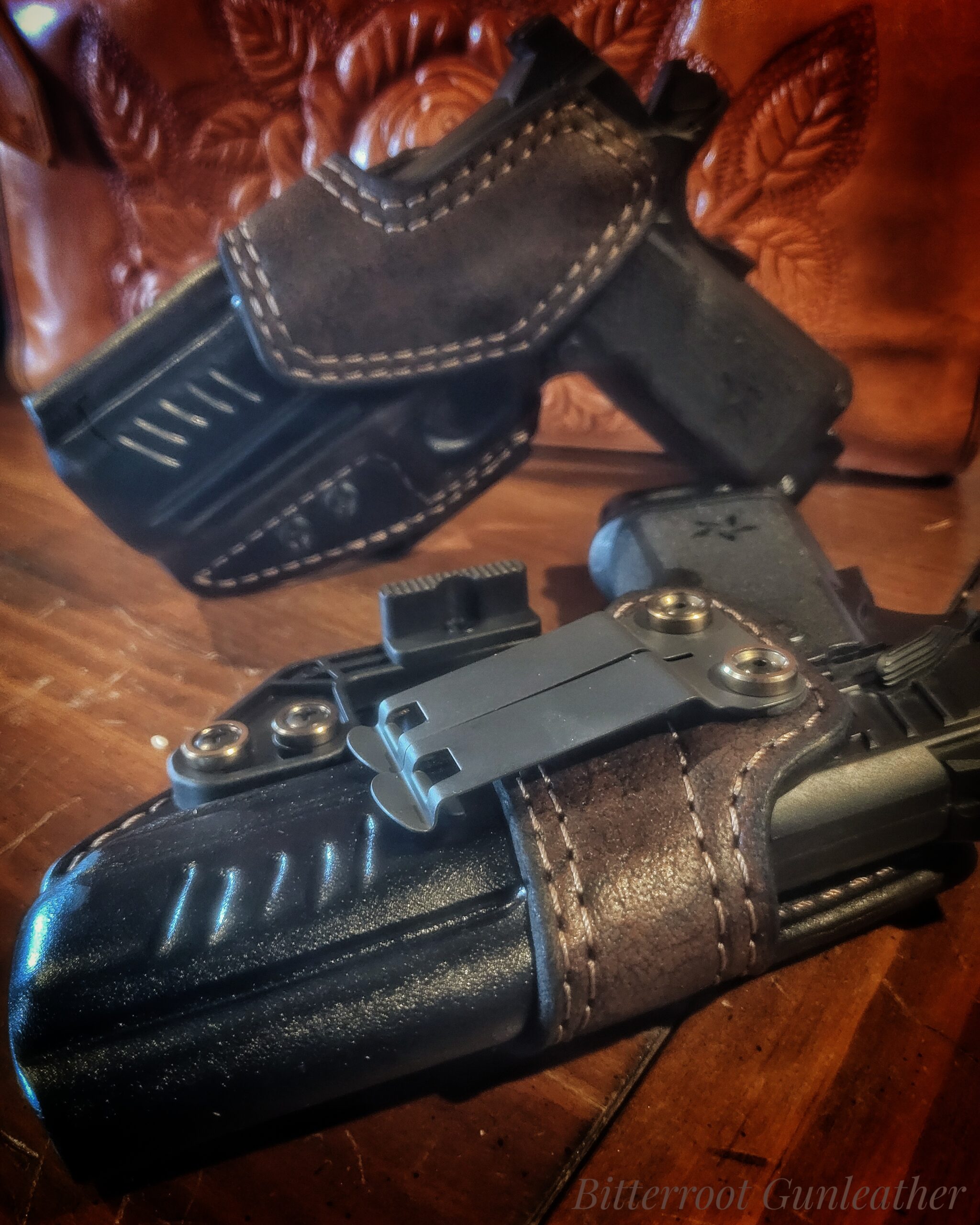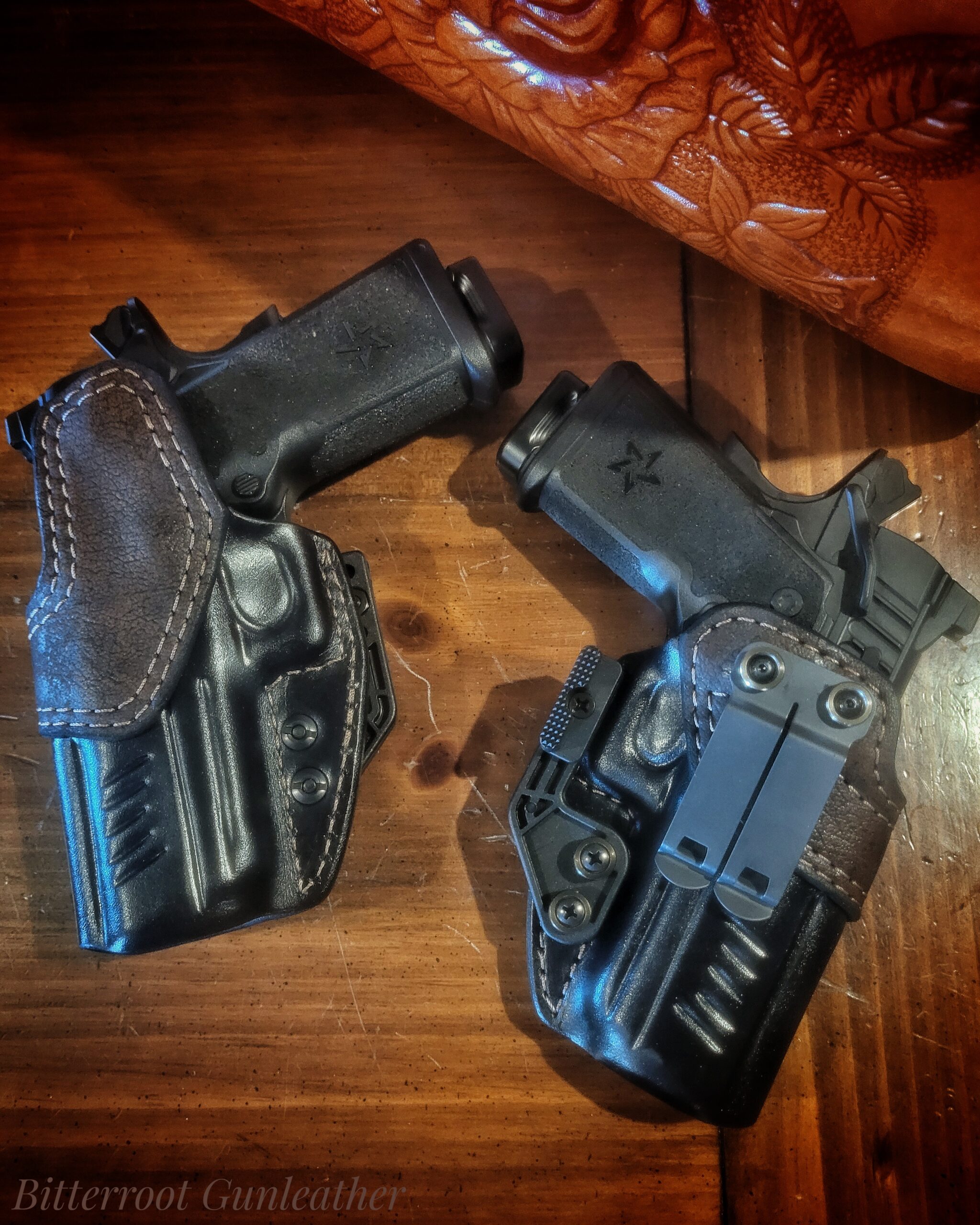 Bringing out the classier side of concealment with an exotic material upgrade. This River Access AIWB (Appendix Inside the Waist-Band) holster is designed specifically for the Staccato C 2024, and accomodates most optics, just not Trijicon SRO or RMR-HD unless you have a certain reareward-setting aftermarket optic plate. The main body of the holster is Hermann Oak veg-tan steer hide, hand dyed in a classy smooth black. The mouth reinforcement is a base of Hermann Oak veg-tan for structure, overlaid with light brown Safari Cape Buffalo hide from Zimbabwe. The holster is submerged in an acrylic clear coat to help repel moisture and provide a lovely shine.