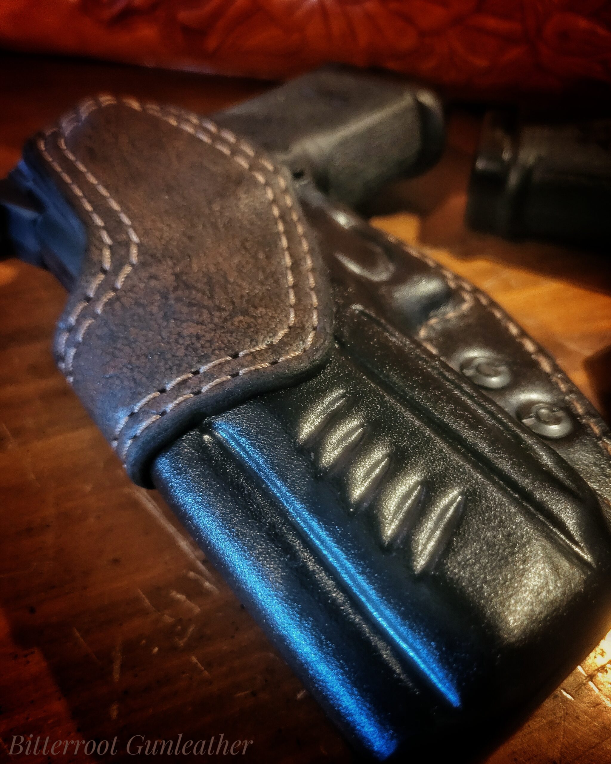 Discreet Carry Concepts Monoblock belt clip paired with Mod-Wing concealment claw provides a secure fit to a standard 1.5″ gunbelt up to 1/4″ thick. I used chestnut thread for a subdued contrast, and antique-brown anodized aluminum finishing washers to gently whisper elegance and class that would play well with the cape buffalo.